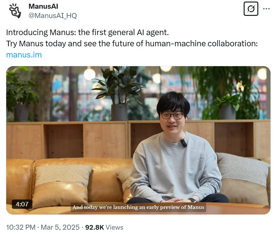 官方 X 表示:Manus 是第一个通用 AI 智能体,代表了人机协作的未来。