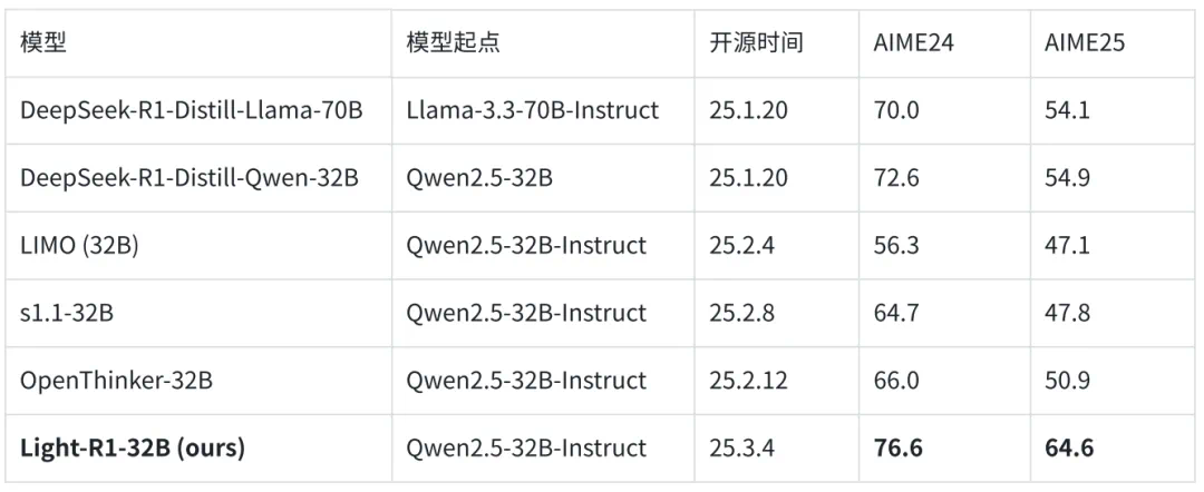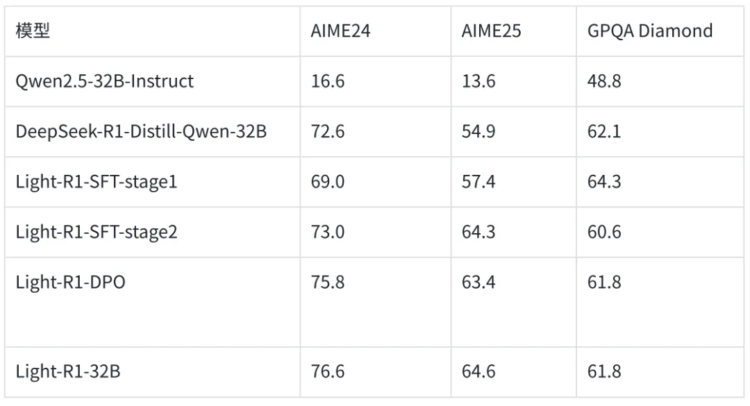 完整评测代码和结果:基于 DeepScaleR 的评测工具,Light-R1-32B 的原始采样结果也在 Huggingface 模型目录下。