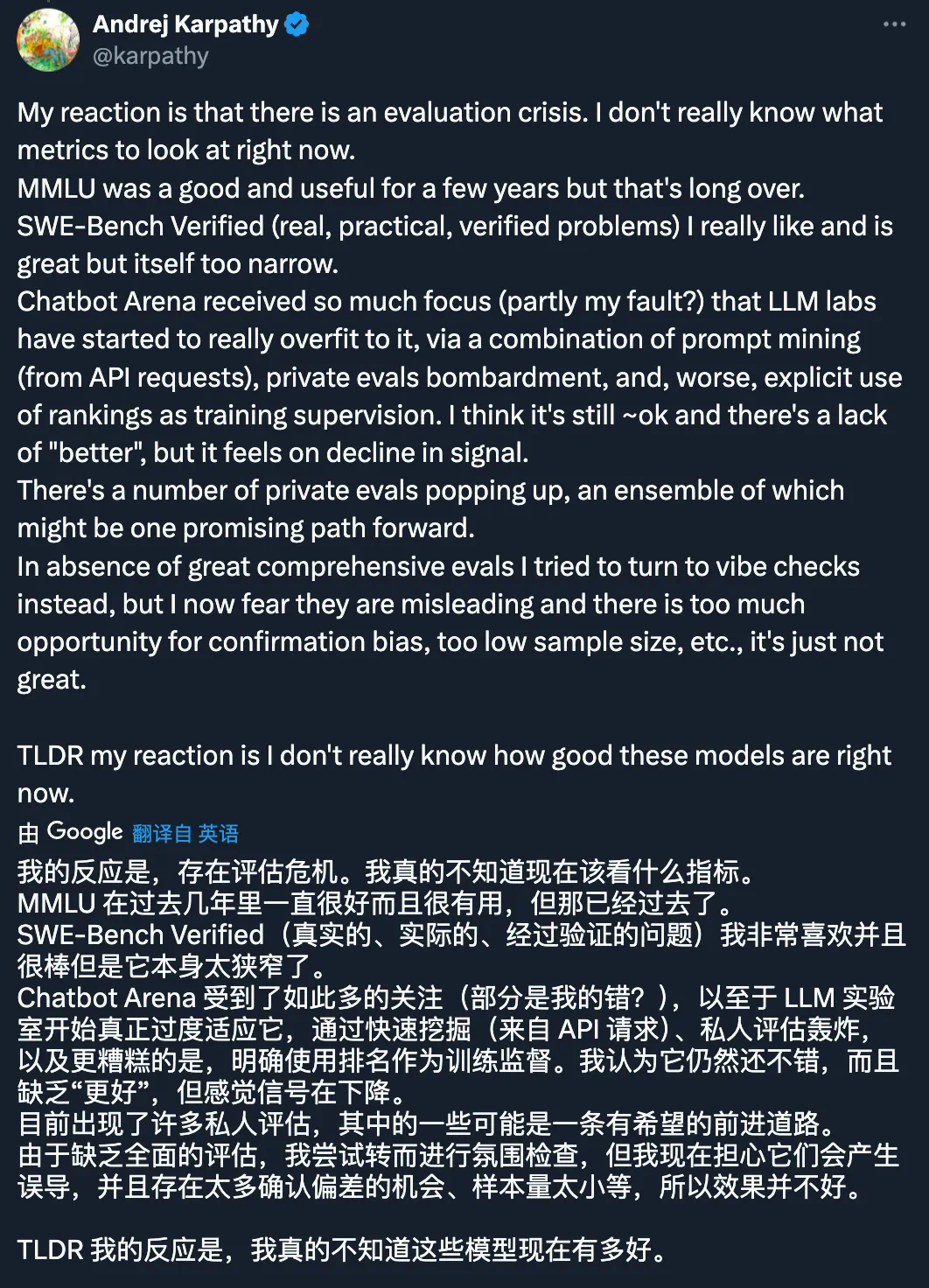 Andrej Karpathy 最近就陷入了「评估危机」:「我真不知道现在应该关注什么(AI)指标。简而言之,我的反应是,我真的不知道这些模型现在有多好。」