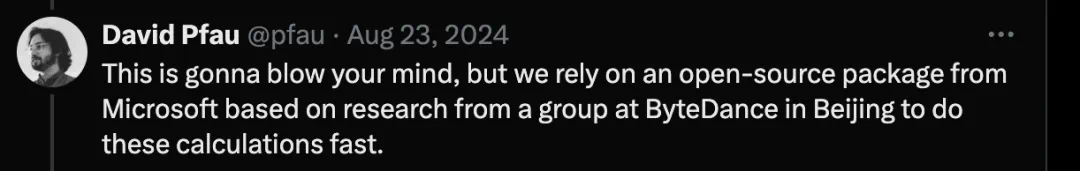 “这也许会让你大吃一惊,” DeepMind 研究员 David Pfau 在社交媒体上评论道,“但我们依靠微软基于北京字节跳动团队研究的开源包来快速完成这些计算。”