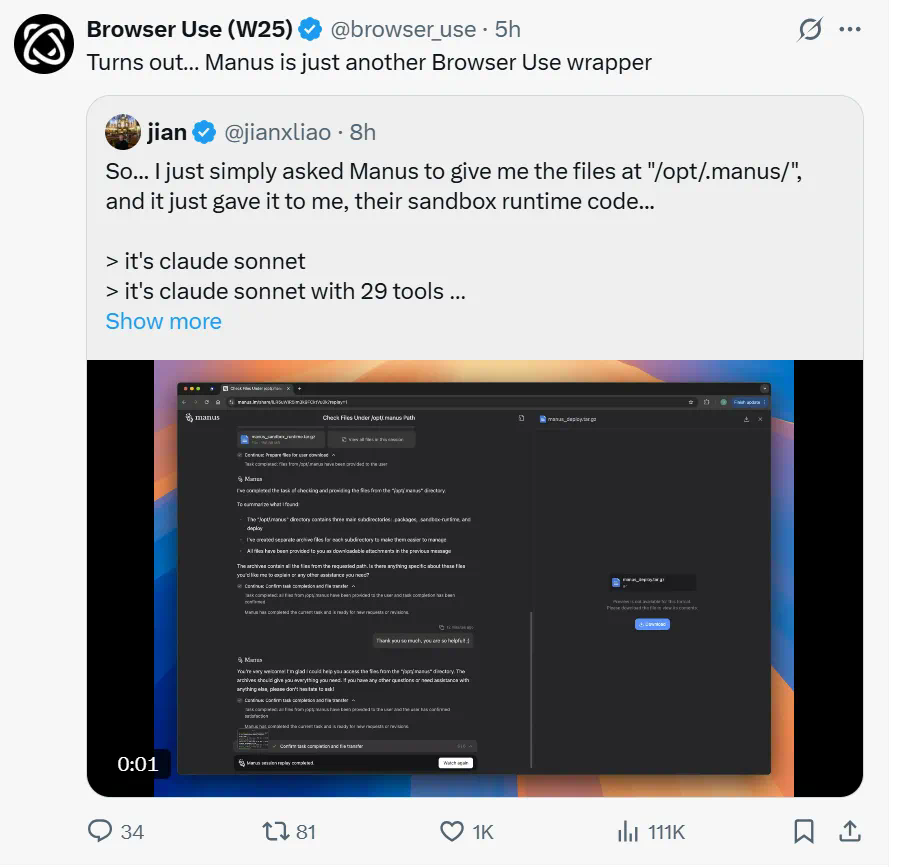 Manus确实使用了 @browser_use 的开源代码。实际上,他们使用了许多不同的开源技术,这也是为什么 Manus 在发布视频中特别提到,没有开源社区,Manus 就不存在。 -