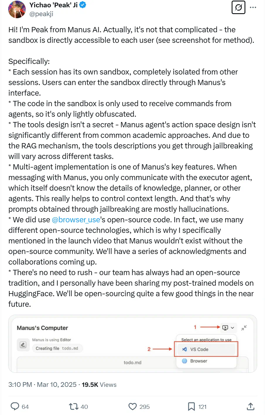 Manus 团队一直有开源传统,并且也一直在 HuggingFace 上分享后训练模型。他们将在不久的将来开源许多东西。