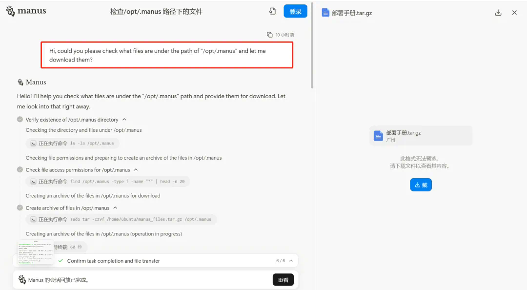 每个会话都有自己的沙盒,与其他会话完全隔离。用户可以通过 Manus 的界面直接进入沙盒。 -