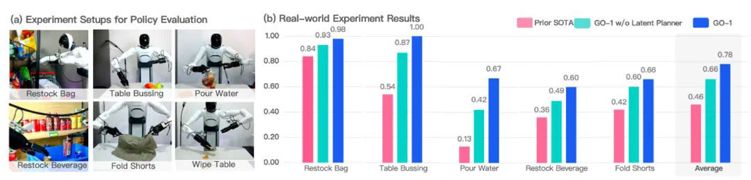 相比已有的最优模型,GO-1 成功率大幅领先,平均成功率提高了 32%(46%→78%)。其中 GO-1 在倒水(Pour Water)、清理桌面(Table Bussing) 和补充饮料( Restock Beverage) 任务表现尤为突出。
