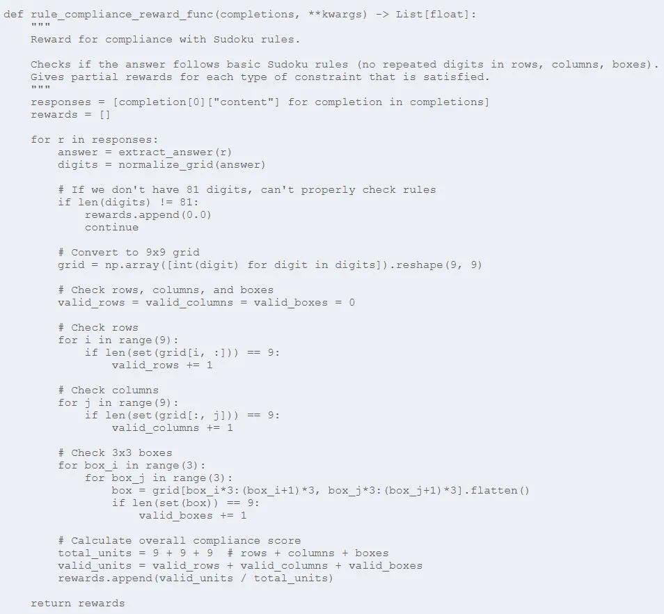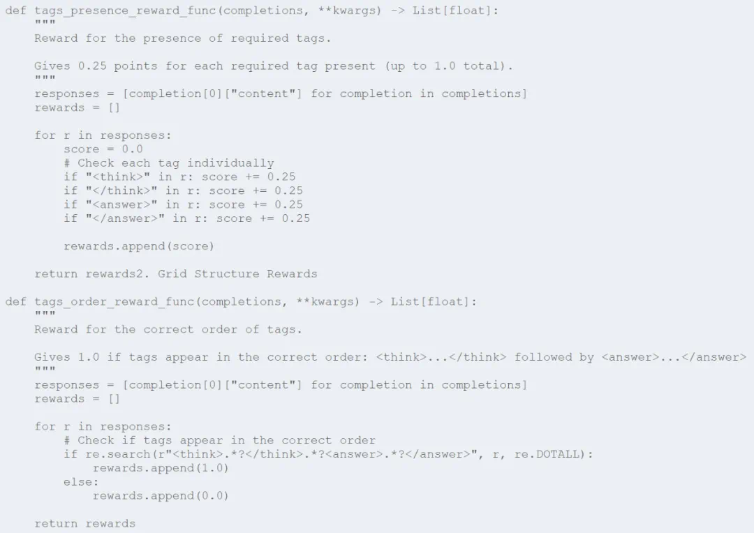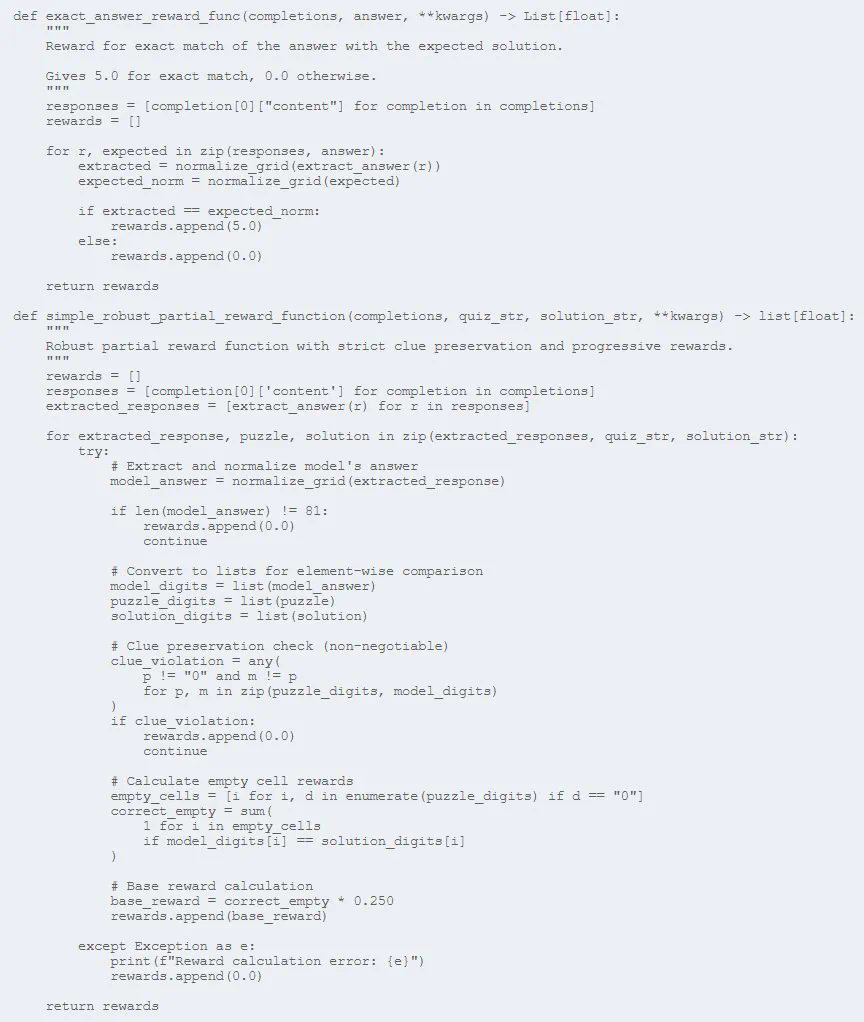额外奖励阈值:这些经过增强的函数包括当模型超过某些性能阈值(75%、85%、95% 正确)时的额外奖励。当模型走上正轨时,这些作为激励里程碑,可以加速学习。 -