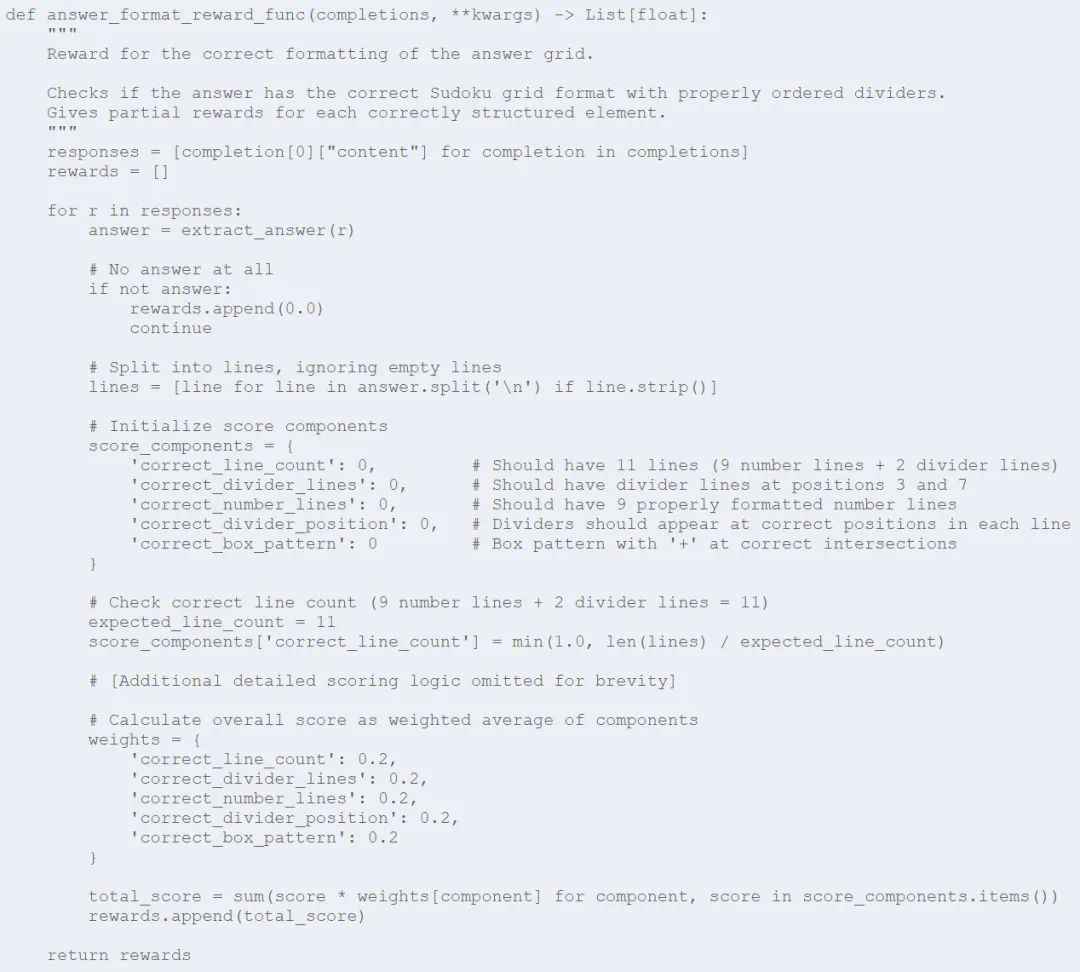 最低奖励底线(我最关注的一点):即使是部分正确的解答也会获得较小的最低奖励(0.05),确保模型即使进展很小,也能获得一些反馈。