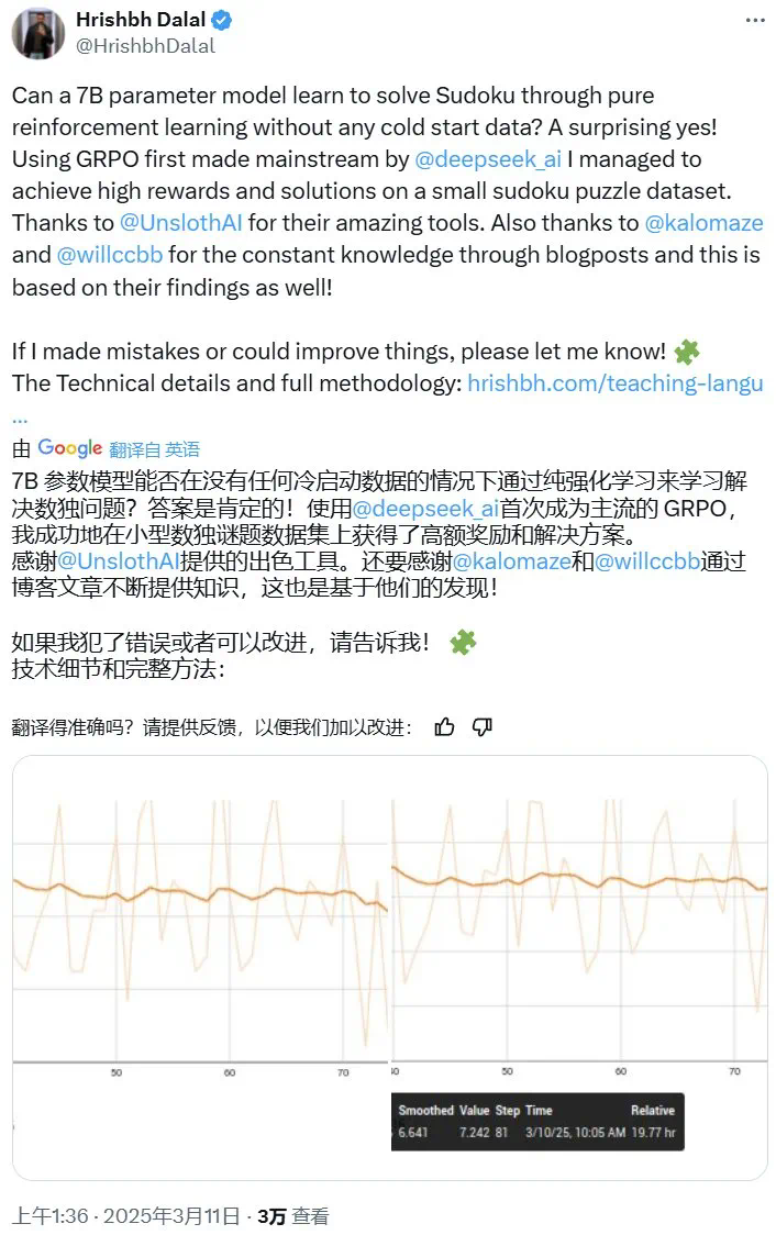 文章来源于互联网:使用DeepSeek的GRPO,7B模型只需强化学习就能拿下数独