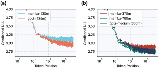 在 PG19 真实数据集实验中(图 3),研究团队观察到显著的位置相关性能差异:当处理 4096 token 文本的后半段时,355M 参数的 GPT-2 Medium 与 790M 参数的 Mamba 模型达到相近性能,而参数更小的 Mamba-130M 在后半段显著劣于同体量 Transformer。这与 L²M 条件的预测完全一致——Transformer 的隐状态自然扩容特性使其在长上下文建模中具有架构优势。