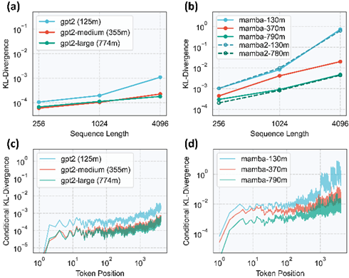 研究团队通过合成数据集实验验证了这一理论(图 2)。在模拟自然语言互信息特性的高斯分布上,Transformer 在不同长度下保持稳定的 KL 散度,而 Mamba 类模型随着序列延长性能显著下降,必须增大模型尺寸才能匹配 Transformer 的表现。