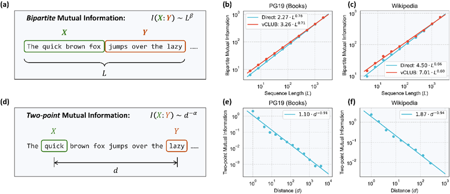 通过使用 LLaMA-3.1 405B 等先进模型作为概率分布估计器,他们在 PG19 经典文献数据集和维基百科语料上发现,二分互信息呈现明确的幂律增长特性(I ~ L^β),与两点互信息的幂律衰减形成鲜明对比(图 1b,c vs e,f)。