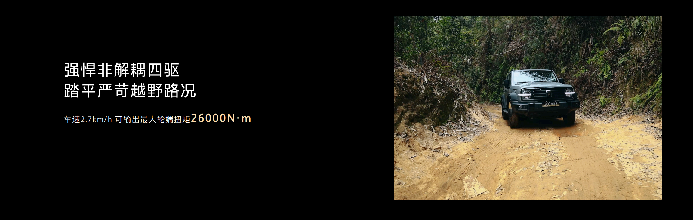 得益于长城汽车24年柴油乘用车研发经验,坦克300柴油版拥有“更劲、更静、更省”三大优势。坦克300柴油版搭载的2.4T全新一代高性能低油耗柴油发动机,专为长途穿越和拖挂需求用户打造,最大净功率135kW,最大净扭矩480N·m,1500rpm即可爆发峰值扭矩。长城汽车技术中心副总经理王超表示,越野要慢,也要慢中有力,坦克300柴油版在2.7km/h时轮端扭矩最高可放大至26000N·m,配合非解耦四驱结构,再复杂的越野场景也能从容应对。