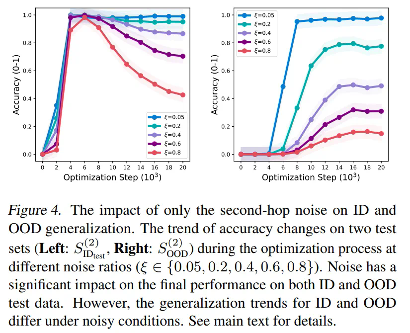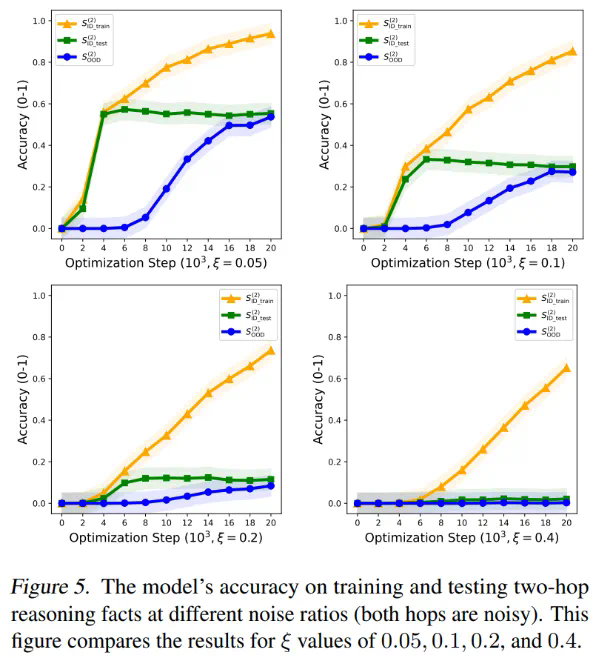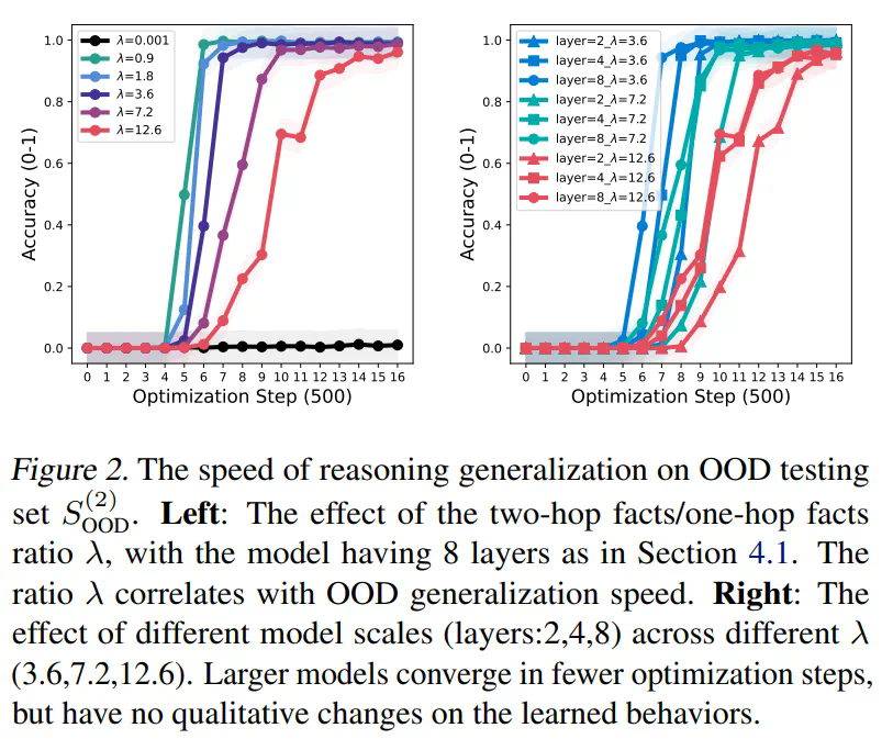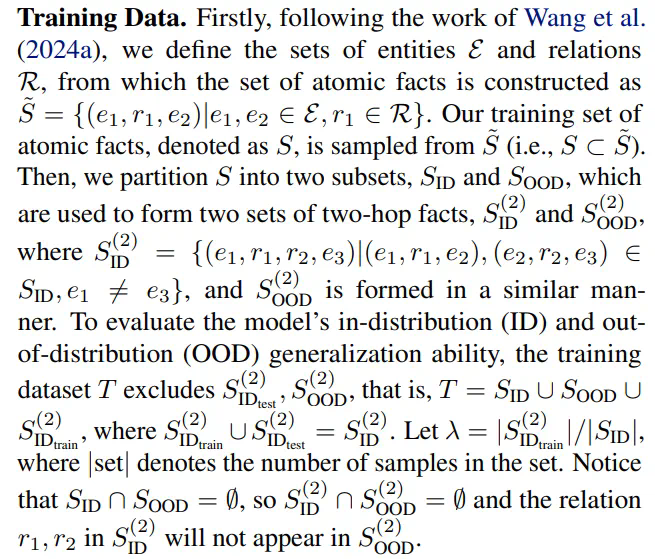 事实上测试模型来实现的。若模型在分布内数据上表现良好,可能仅表明其记忆或学习了训练数据中的模式。然而,在分布外数据上的优异表现则表明模型确实掌握了潜在模式,因为训练集仅包含原子事实