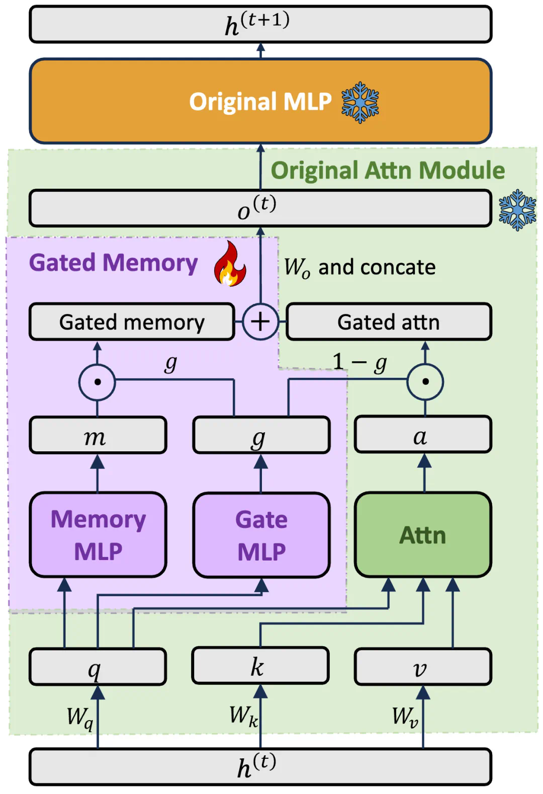 平衡模型参数知识和原有能力。由于模型原有参数(比如 Llama 3 8B)通常显著大于记忆长文本所需的参数量,全参数微调面临过拟合长文本而损失模型基础能力的风险。为了在模型原有能力和微调后新的参数内知识之间找到平衡,我们提出了一种专门的参数高效微调模块——门控记忆适配器(Gated Memory Adapter),它能平衡原始模型的 In-Context Learning(ICL)能力和 LIFT 训练后对长输入的记忆理解能力。