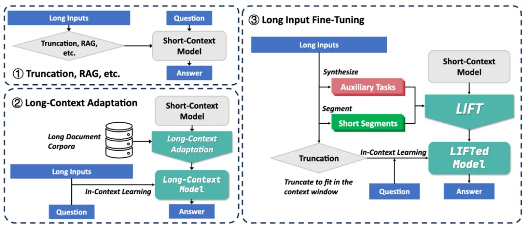 动态高效的长输入训练。LIFT 能够通过调整模型参数,动态适应新的长输入文本,将其作为新的知识源,无需进行资源密集型的 long-context adaptation。针对每一篇需要处理的长文本,LIFT 通过分段的 language modeling 以及精心设计的辅助任务来微调模型,实现用模型参数来记忆和理解长文本,从而避免过长的 context 造成的推理复杂度提升和长程依赖丢失。