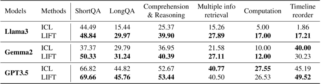 LIFT 的效果与模型的原有能力以及测试任务有关。LIFT 虽然普遍提升了模型的长文本能力,但在部分子任务上仍有改进空间。通过分析各个子任务,研究团队认为与测试问题相似的辅助任务可以促进模型关注对测试任务有用的长上下文信息,有助于下游任务表现。