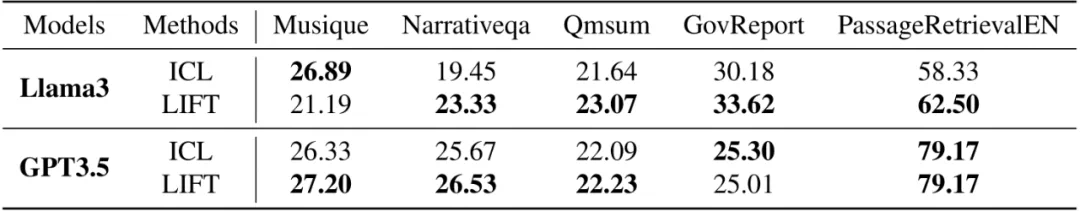 LIFT 提升了短文本模型在 Longbench 的大多数子任务上的表现。研究团队从 LongBench 中选取了 5 个具有代表性的子任务进行测试,任务包括多篇文章间的多跳推理、阅读理解和概括、检索召回等,Llama 3 通过 LIFT 在其中 4 个子任务上均有提升。
