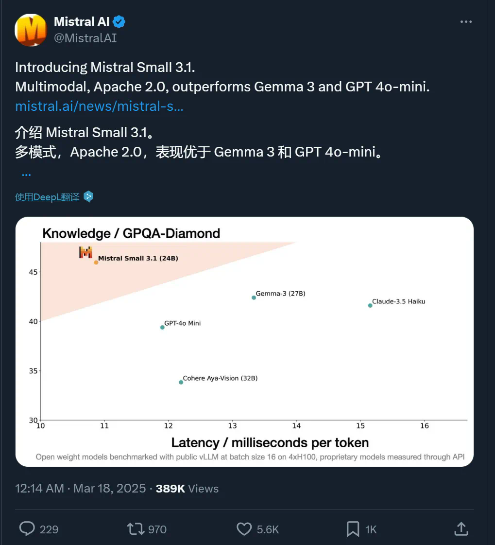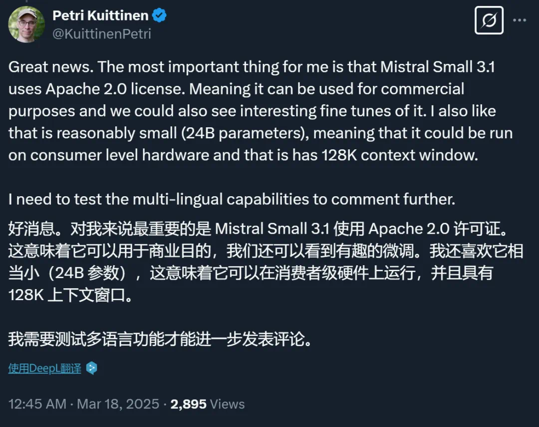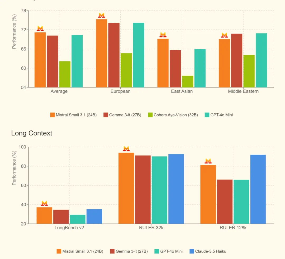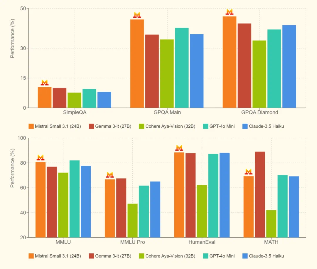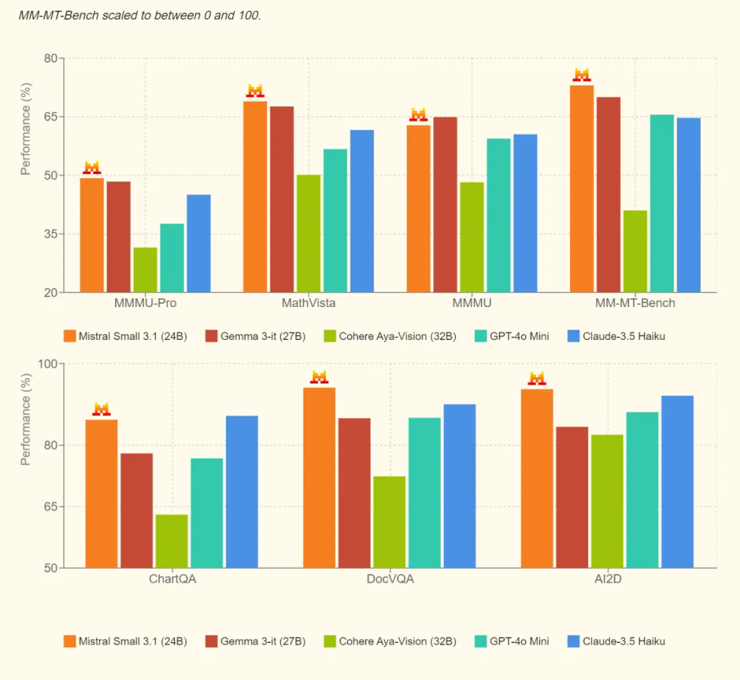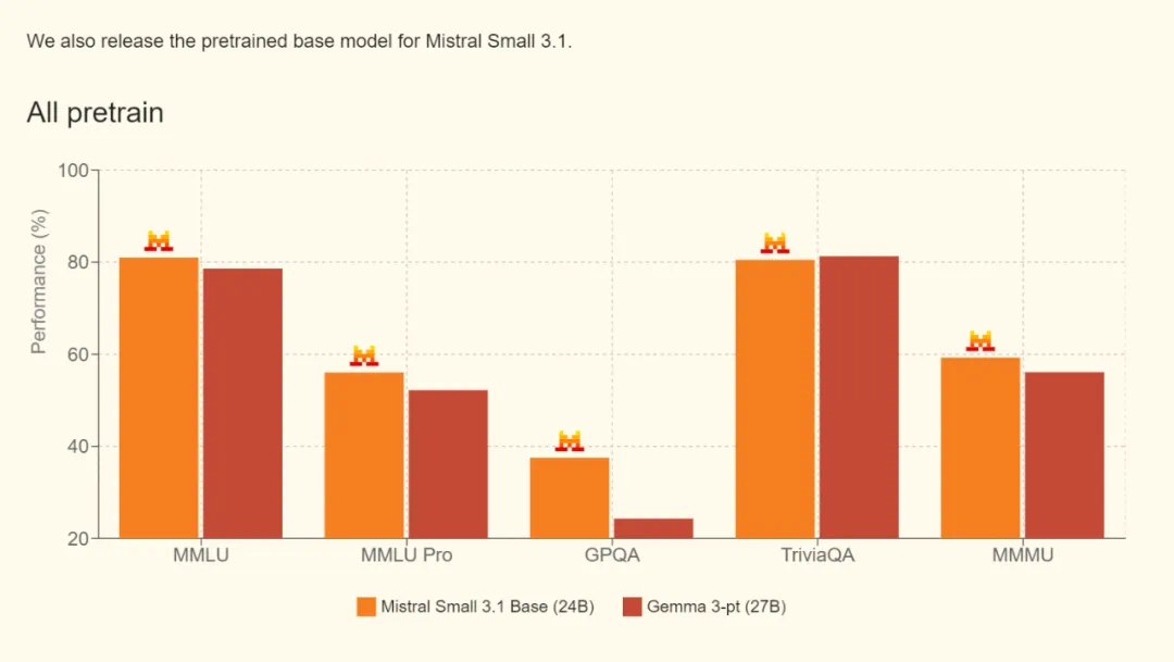 高级推理的基础:开放的 Mistral 模型已经被开发者用来构建出色的推理模型,比如 Nous Research 的 DeepHermes 24B 就是基于 Mistral Small 3 构建出来的。为了鼓励这种创新,Mistral AI 发布了 Mistral Small 3.1 的基础模型和指令检查点,以便社区进一步对模型进行下游定制。