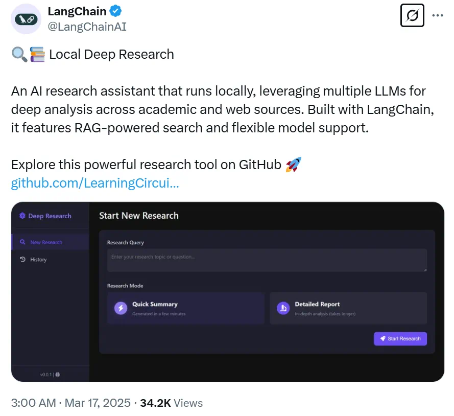 我们可以将其看作一个强大的 AI 研究助手,它使用多个 LLM 和网络搜索进行深入的、迭代的分析。该系统可以本地运行,从而保护用户隐私,你也可以使用基于云的 LLM 以增强其功能。