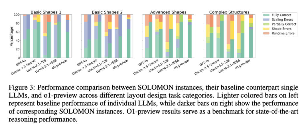 为了评估 SOLOMON 的有效性,研究团队在 25 个半导体布局任务上进行了实验,采用五个基线 LLM 进行了比较,包括 GPT-4o、Claude-3.5-Sonnet 和 Llama-3 等,旨在评估模型在生成几何结构时保持空间准确性的能力。SOLOMON 在减少运行时错误和扩展不准确性方面表现出改进,展示了更好的空间推理能力,提高了布局精度并减少了生成设计中的错误。