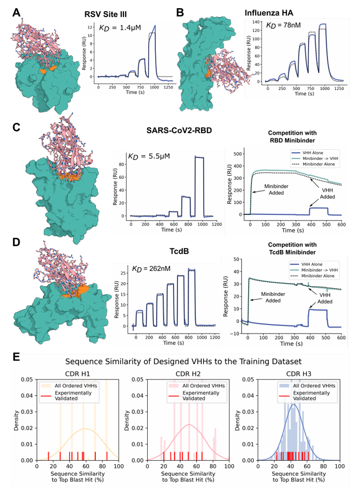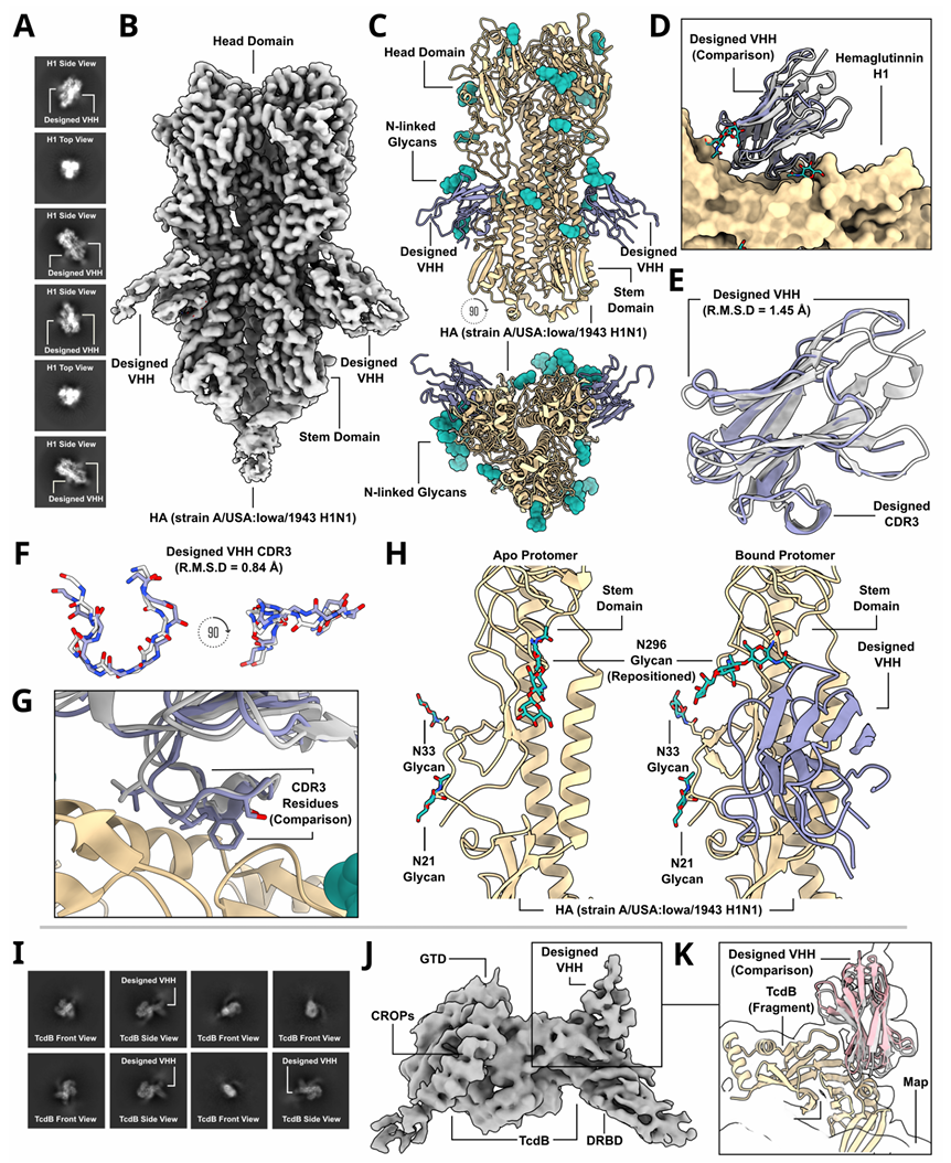 实验表明,从头设计针对目标上特定表位的抗体结构域是可能的。设计的 VHH 针对流感 HA 和 TcdB 的低温电子显微镜结构数据与计算设计模型非常接近,表明该方法可以设计具有原子精度的 VHH 复合物(包括高度可变的 H3 环和整体结合方向),这些复合物与 PDB 中任何已知结构都非常不同。