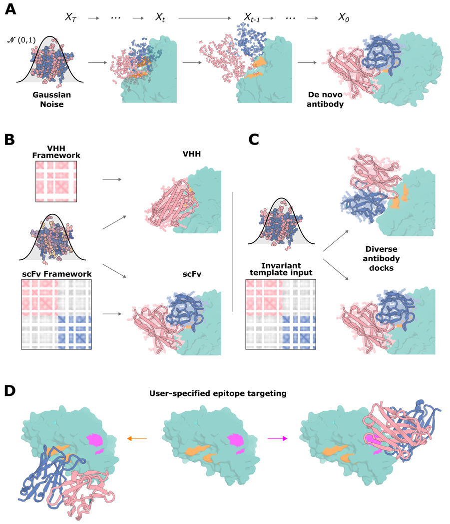 设计从头抗体的理想方法将能够 1) 针对任何感兴趣的靶标上的任何特定表位;2) 重点采样 CDR 环,使框架序列和结构接近用户指定的高度优化的治疗性抗体框架;3) 采样设计抗体相对于表位的替代刚体位置。
