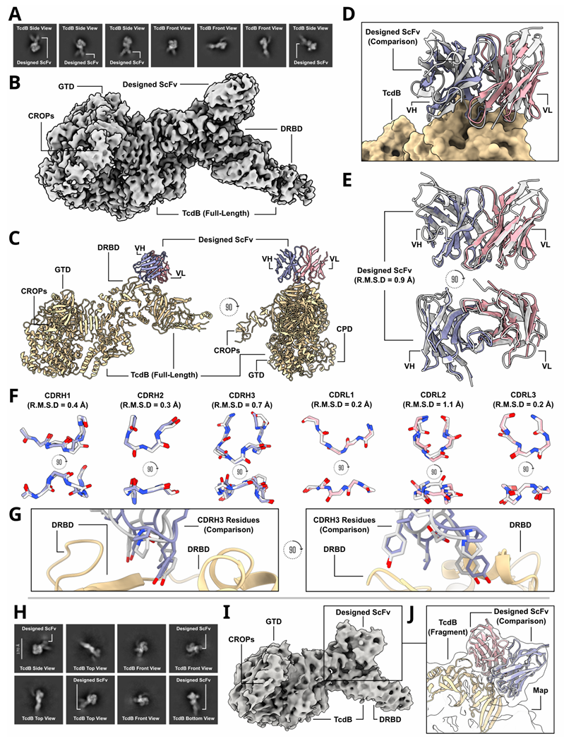 团队进一步展示了单链可变片段(scFvs)的从头设计,通过结合设计的重链和轻链 CDR 创建 TcdB 和 Phox2b 肽-MHC 复合物的结合物。低温电子显微镜结构数据证实了两种不同的 TcdB scFv 的正确免疫球蛋白折叠和结合姿势,其中一种设计的高分辨率数据还验证了所有六个 CDR 环的原子级精确构象。
