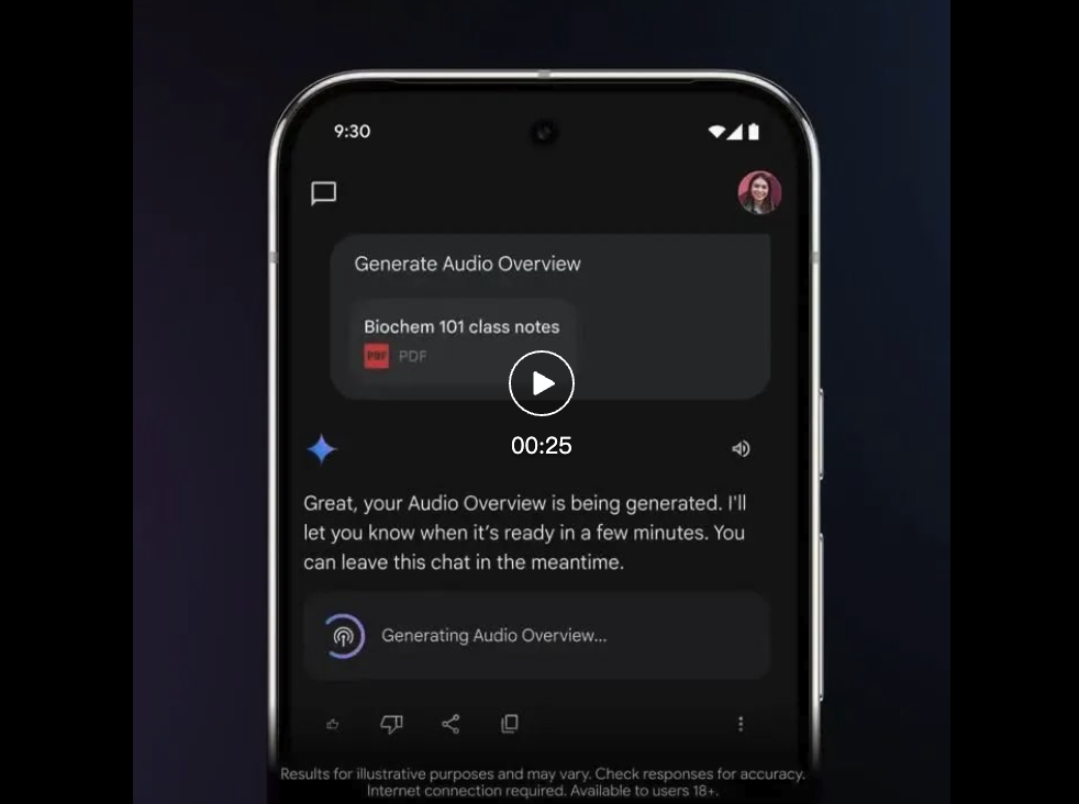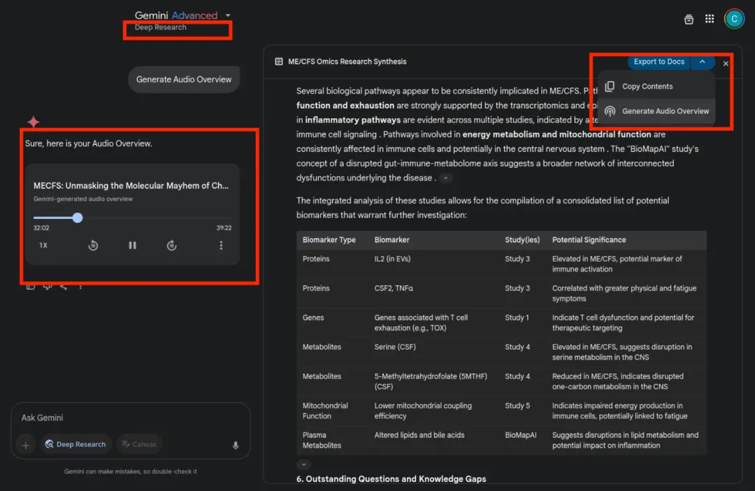 当你用 Deep Research 生成深度报告后,系统会自动提示「Audio Overview」,建议你继续用 AI 双人脱口秀的方式,消化这些内容。