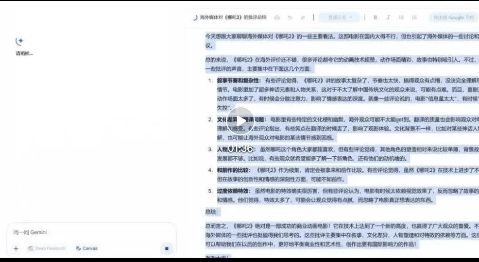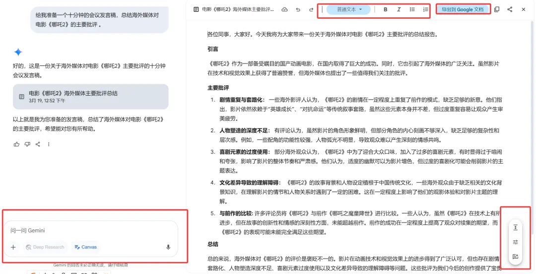让 Gemini 准备一个十分钟的会议发言稿,总结海外媒体对电影《哪吒 2 》的主要批评 。