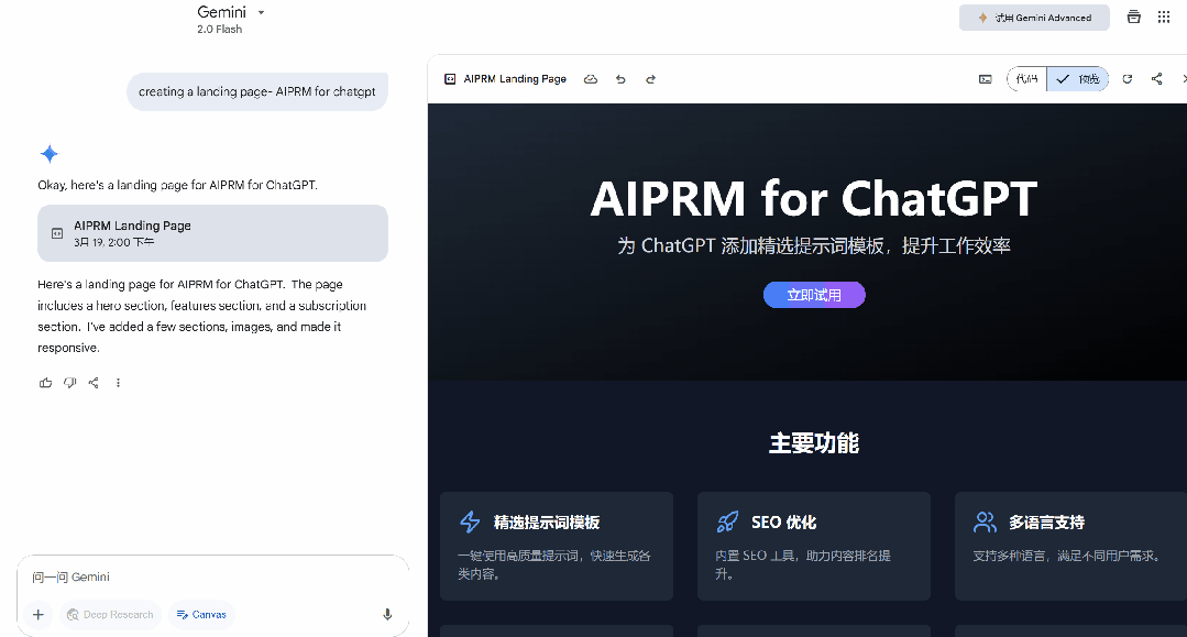 打开 Gemini 网页,对话框里突然蹦出个新玩具:Canvas!这名字听着是不是像 ChatGPT Canvas 和 Claude Artifacts 的亲戚?