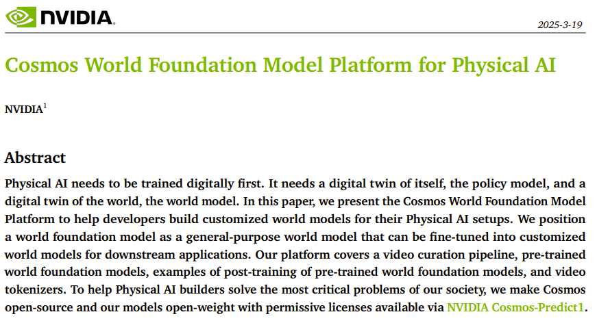 最后,英伟达公开了 Cosmos 世界基础模型平台的技术报告: