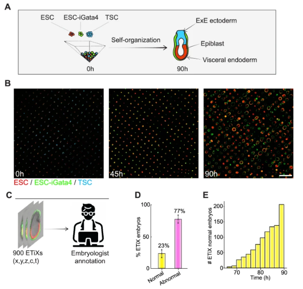 在三个独立实验中分析的 ETiX 胚胎中,只有 23% (206) 在整个观察期间符合正常发育的标准。通过进行延时研究,他们注意到大多数 ETiX 胚胎的发育并不同步。因此,他们为处于相似发育阶段的每个 ETiX 胚胎注释了一个结束时间点,将其称为同步数据集,并随后用于训练深度学习模型 StembryoNet。