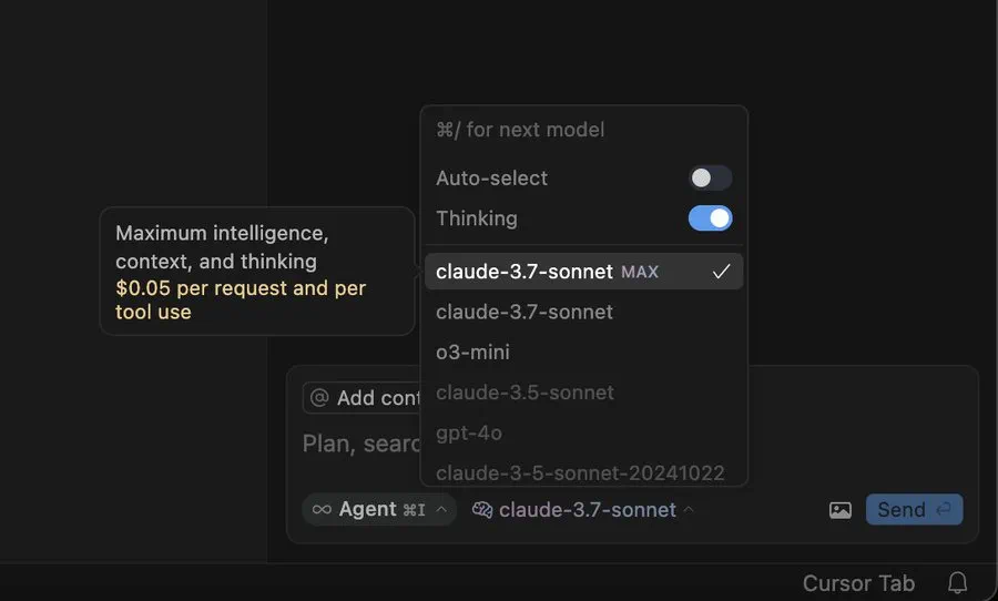 AI 编程神器 Cursor 新鲜出炉 Claude Max 模式(MAX 代表了最大智能)!这波操作有点猛。其核心优势在于处理大规模代码和复杂逻辑时表现出色,适合硬核开发者和大型项目。Claude Max 是 Claude 3.7 的一种更强大配置,它以 Claude 3.7 Thinking 模型为基础。具有超强的创造力,能在其他模型失灵时脱颖而出,解决更复杂、更精妙的任务。其次,它的上下文窗口高达 200K,这意味着你可以尽可能多地将代码放入提示中。以前的模型在处理这类任务时表现不佳,但 Claude 3.7 是第一个在处理如此大的上下文窗口时表现更好的模型。此外,Claude Max 将工具调用限制提高到了 200 次,这意味着它可以一次性进行大量编辑,并在整个代码库中收集上下文! 最后,它可以一次性读取更大块的代码。不过,想要尝试的小伙伴要悠着点了,可能一个不小心就榨干你的钱包,因为 Claude Max 收费不包含在标准 Pro 订阅中,每次请求和工具调用均需支付额外的费用:即采用按使用量计费的方式,每次请求(prompt)收费 0.05 美元,每次工具调用收费 0.05 美元;对于大多数用户来说,可能不值得花费这些钱。如果不加以控制,Claude Max 在完成其可用的 200 次工具调用后,可能会花费你 10 美元。只能说,复杂点的项目可以尝试一下,一般项目用其他模型应该就够用了。现在,X 上已经有用户在晒使用体验了。