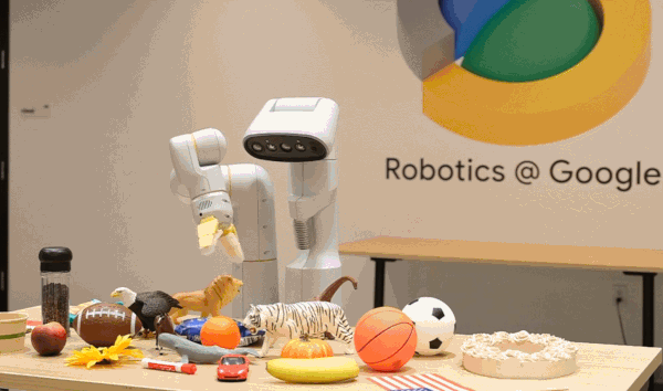 RT-2 是全球第一个控制机器人的视觉 – 语言 – 动作(VLA)模型。这个模型让机器人不仅能解读人类的复杂指令,还能看懂眼前的物体(即使这个物体之前从未见过),并按照指令采取动作。比如,你让机器人拿起桌上「已灭绝的动物」。它会抓起眼前的恐龙玩偶。RT-2 被认为是机器人制造和编程方式的重大飞跃。