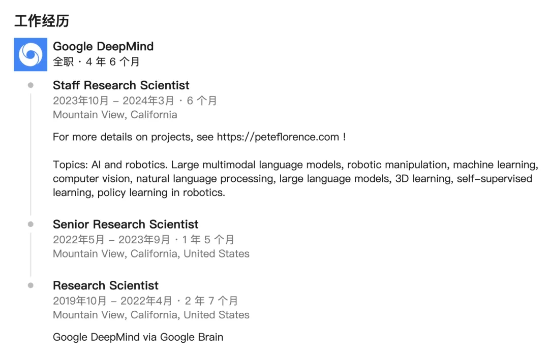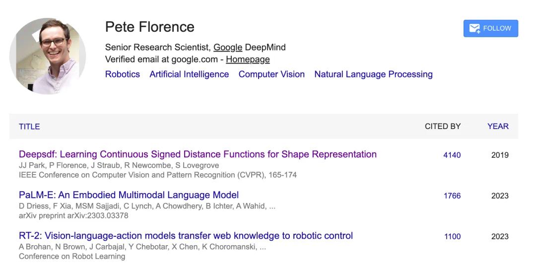 4 年多的谷歌 DeepMind 生涯中,Pete Florence 参与了很多项具备里程碑意义的机器人和大模型研究,其中最具代表性的有