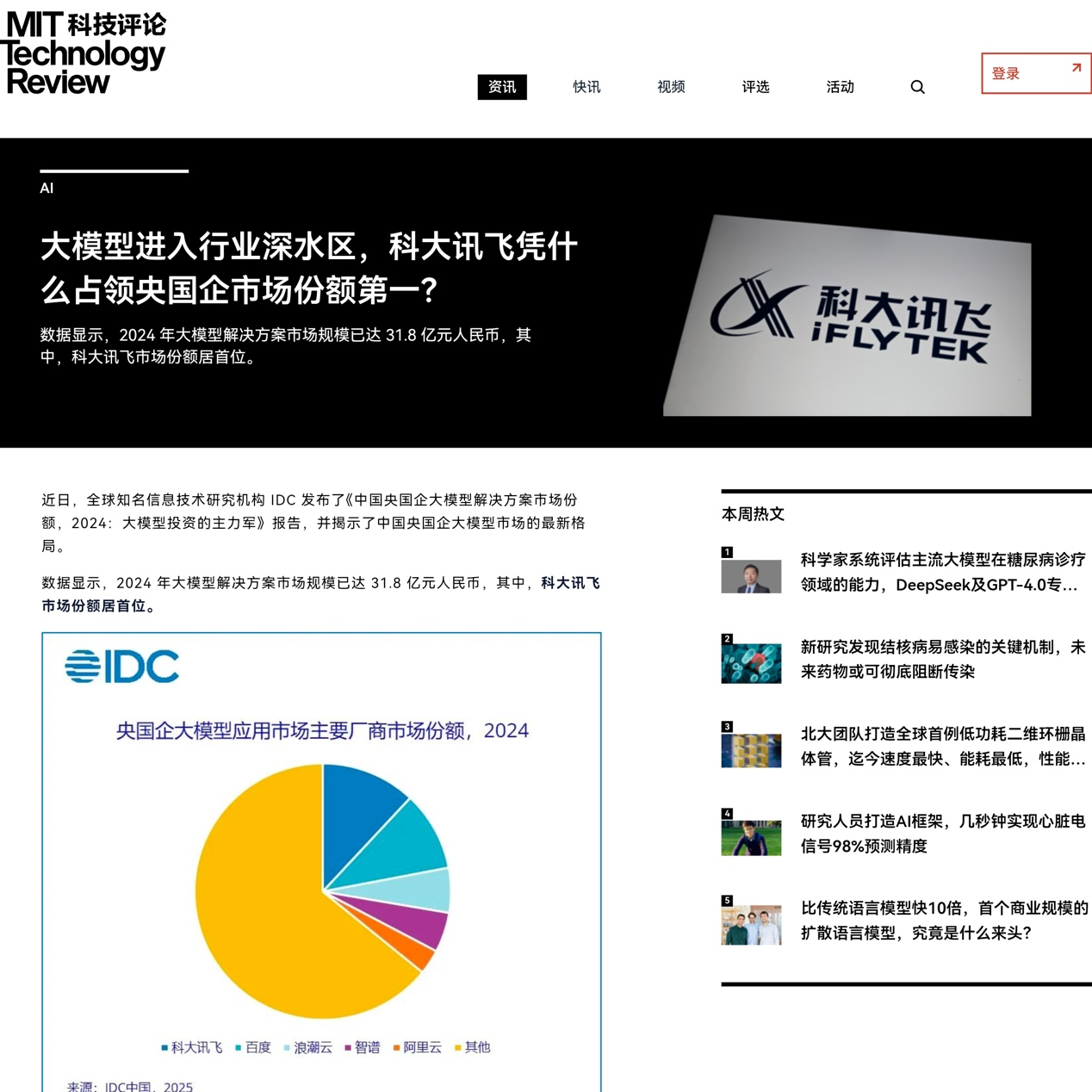 3月19日,IDC发布的最新报告显示,科大讯飞在央国企大模型解决方案市场中占据首位,领先百度和阿里等互联网巨头。这份仅以纯大模型能力维度统计的报告,揭示了AI赛道的全新竞争法则:在央国企这个战略高地的争夺中,技术实用性与产业落地能力正取代单纯的技术参数比拼,成为决胜关键。