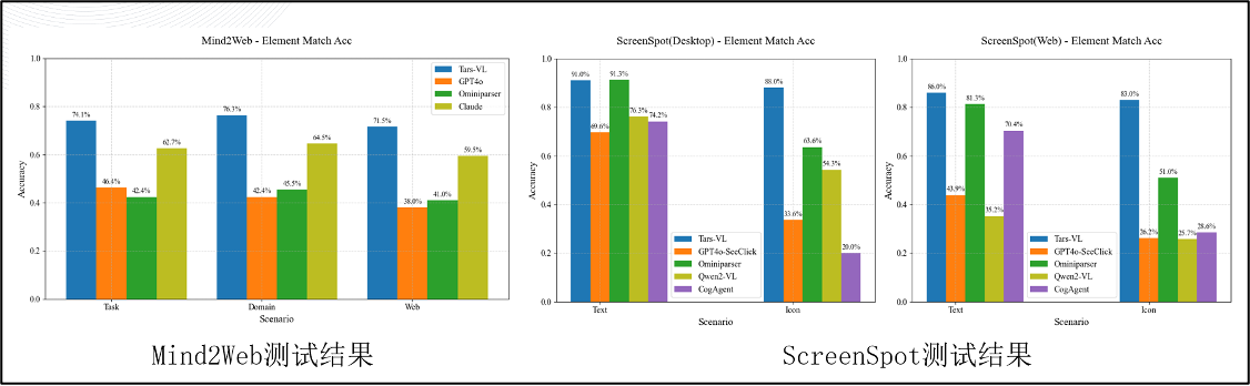 ● 在 mind2web 数据集上,TARS-VL 在 Task、Domain 和 Web 三个场景上的元素匹配准确率,比 GPT-4o、Ominiparser、Claude 等模型高出 10%;