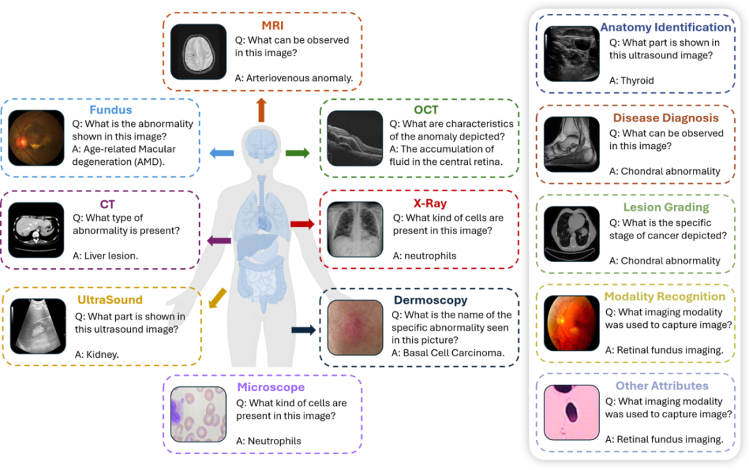 论文中,研究者使用了一个多模态医疗影像数据集 OmniMedVQA,覆盖了 CT、MRI、X 光、超声、皮肤镜、眼底照相(Fundus)、OCT、显微镜图像(Microscopy) 等八种常见的医疗影像模态,并包含五大类临床问题: