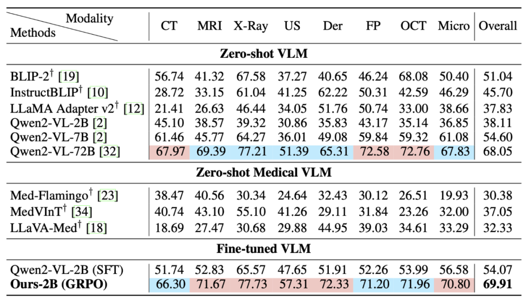 研究者将 DeepSeek 强化学习得到的 Med-R1 模型,与多种基线进行对比:包括通用 VLM(BLIP-2、InstructBLIP、Qwen2-VL 等)和已有的医疗 VLM(Med-Flamingo、MedVInT、LLaVA-Med 等),评测它们在不同影像、不同任务下的推理准确率。