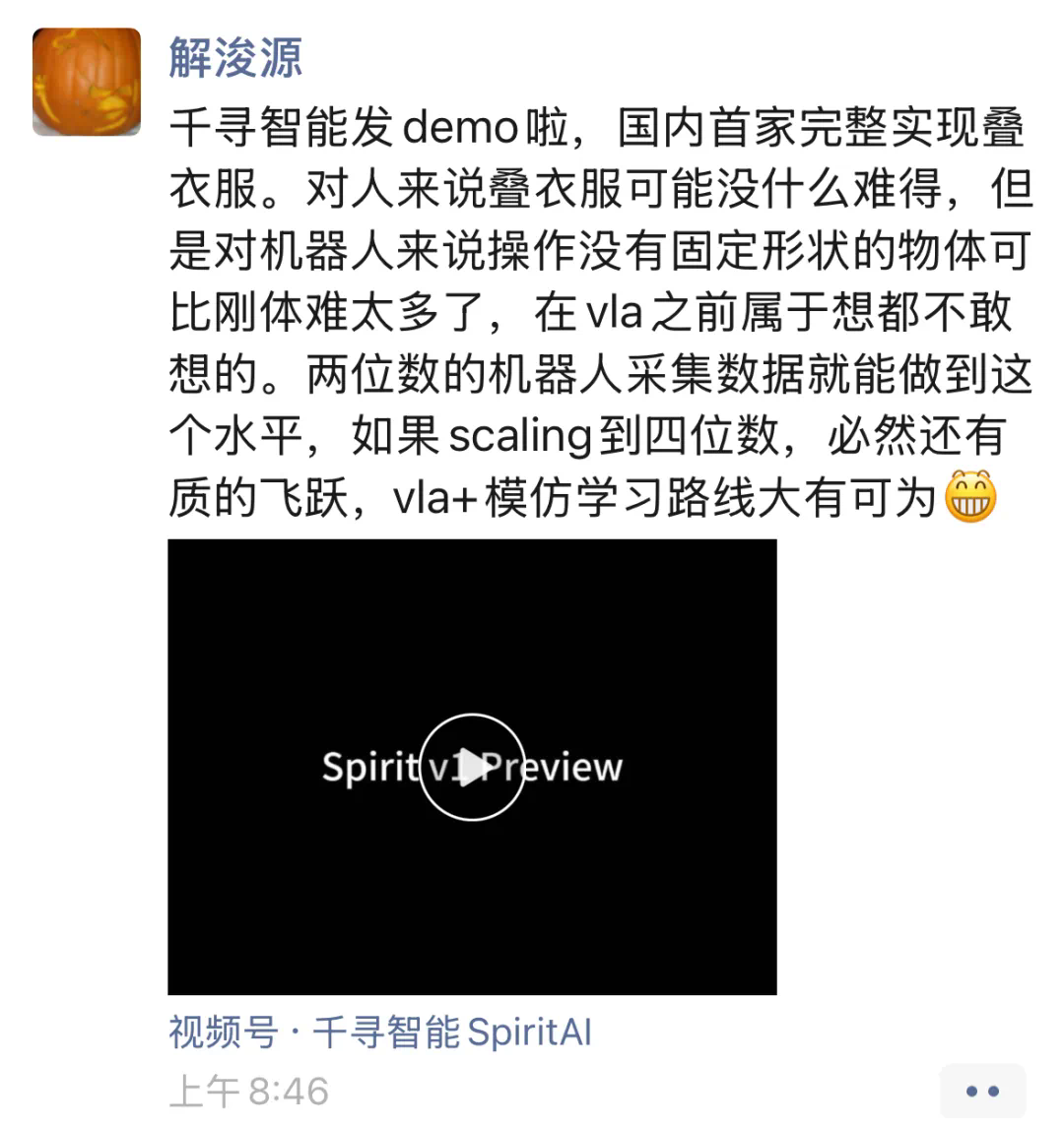 近日,前字节跳动 AI 技术专家解浚源在朋友圈官宣加入具身智能创业公司千寻智能,并发布了千寻智能最新披露的 Spirit v1 VLA 演示视频。据悉,解浚源目前任职千寻智能具身智能部负责人,全面负责具身大模型的研发工作。解浚源,本科毕业于中国科学技术大学,博士毕业于美国华盛顿大学。曾在 nips,eccv 等多个领域顶级会议发表论文,论文被引用超过一万次。他曾是知名开源项目 mxnet 的早期创立者之一和后期主要架构师,先后任职亚马逊资深科学家和字节跳动 AI 高级专家,在系统架构、机器学习算法和应用落地方面都有丰富的经验。原字节跳动 AI 大将加盟具身智能头部公司千寻智能是国内领先的具备 AI + 机器人全栈生产力级技术能力的具身智能公司,技术团队在具身大模型、机器人以及场景落地方面兼具领先性。创始人兼 CEO 韩峰涛在机器人行业拥有十余年经验。曾任珞石机器人联合创始人兼 CTO,组建了世界级水平的运控和算法研发团队。联合创始人高阳在美国加州大学伯克利分校获得博士学位,在强化学习、视觉语言模型(VLM)和机器人任务规划方面取得了多项突破性成果,其提出的 ViLa 和 CoPa 模型被广泛应用于全球领先的机器人项目。AI 业内人士评价称,解浚源的加入将为千寻智能注入强大的技术动力。解浚源在 AI 领域的丰富经验,将帮助千寻智能的具身大模型实现更快的技术迭代和演进。具身智能迎来 “曙光时刻”具身智能正成为全球科技领域最火热的赛道之一。随着大模型技术的突破和应用场景的不断拓展,具身智能正从概念走向现实,展现出巨大的发展潜力。千寻智能凭借其在技术、人才和资本上的多重优势,正在加速推动这一领域的产业化进程。“我曾经和很多业内的具身智能公司有过接触,加入千寻智能的原因是非常认可千寻的技术路径和可落地性。” 解浚源曾在社交媒体上表示,“大语言模型的快速发展为具身智能的落地提供了很好的基础,大家都觉得 5 年之后就能实现 AGI,但却普遍对具身智能真正落地的周期不置可否。我认为,具身智能已经迎来了曙光,可落地的高性能具身智能机器人正在向我们走来。” 在他看来,具身智能的核心价值在于让机器人真正理解物理世界的摩擦力、惯性与材料形变,让 AI 真正进入物理世界并进行有实际价值的人机交互。这种技术突破带来的兴奋感远超过纯数字世界的优化。千寻智能成立于 2024 年,成立仅一年就已完成多轮融资。在技术突破和人才优势的双重加持下,千寻智能也在迅速完成着具身模型的迭代。近期,千寻智能发布了 Spirit v1 VLA 抢先版 demo,视频一镜到底地展示了机器人叠衣服的全流程,从抓取、到折叠和堆高都显得非常流畅,也是国内首次攻克柔性物体长程操作难题。人才争夺背后的战略卡位根据 Gartner 发布的《2023 年 AI 技术成熟度评估》,具身智能技术正处于创新爆发期,相关企业研发投入增速迅猛。这一技术代际转换的关键节点,使得顶尖人才的战略布局成为影响行业格局的关键变量。“许多自动驾驶领域的中高端人才正在向具身智能领域转移。” 中国科学院自动化所博士隋伟指出,“具身智能的发展速度比预想的要快,无论是人工智能技术还是硬件的发展都超出预期,具身智能真正落地的时间可能会比想象中更早。”千寻智能创始人兼 CEO 韩峰涛也曾公开表示,未来三年内人才将成为具身智能领域的关键瓶颈。为此,千寻智能将持续发力优秀人才引进,通过构建强大的团队,加速技术研发与商业化落地。这种以顶尖人才为核心的战略布局,不仅为千寻智能在激烈的市场竞争中赢得了先机,也为整个具身智能行业的发展提供了新的方向和动力。