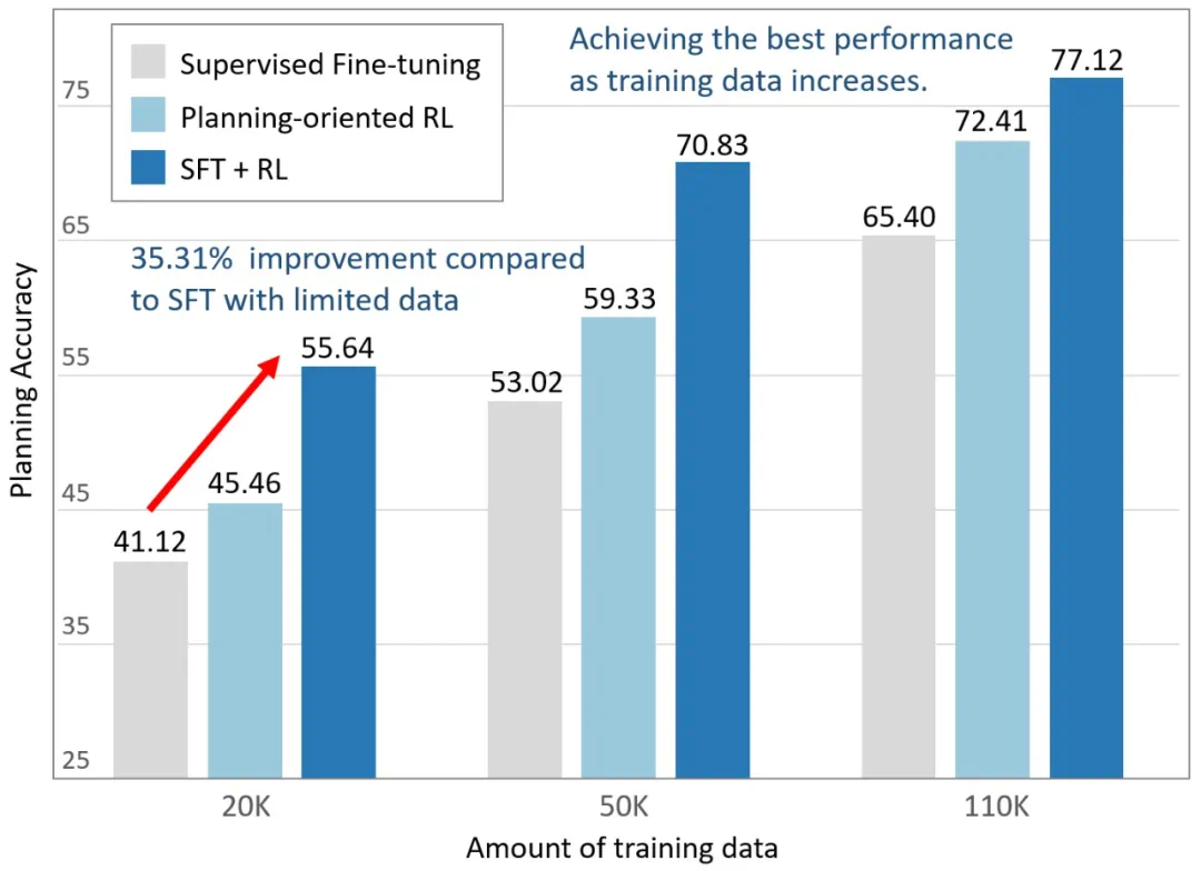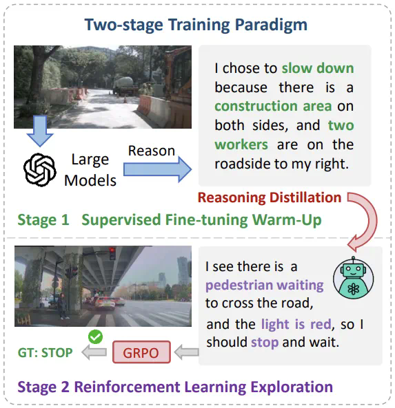 我们提出了基于知识蒸馏的 SFT 和 RL 的两阶段推理训练策略,通过使用云端大模型生成的少量高质量规划推理数据,相比于仅使用 RL 进行训练或者没有推理过程,AlphaDrive 达到了更好的规划效果。