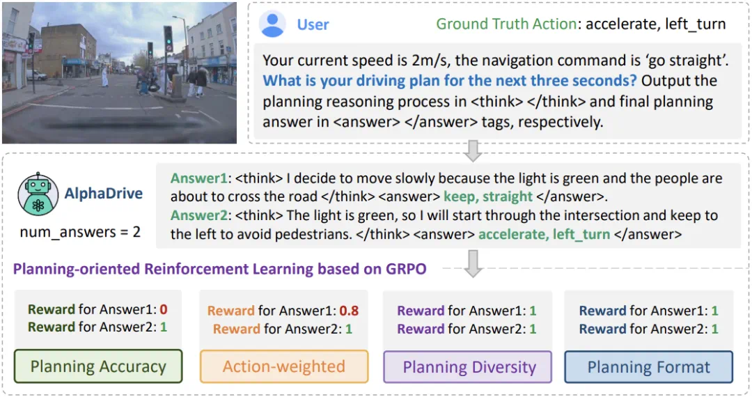 我们提出了 AlphaDrive,一个用于自动驾驶高维规划的视觉语言大模型,据我们所知,AlphaDrive 首次将基于 GRPO 的强化学习和规划推理引入基于大模型的自动驾驶任务,大幅提升了模型的规划表现和训练效率。 -