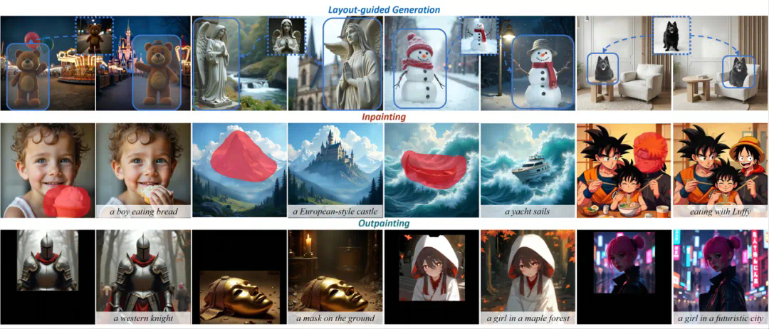 高扩展性:同时支持多种任务,包括多物体处理、物体与场景的整合、inpainting 和 outpainting 等
