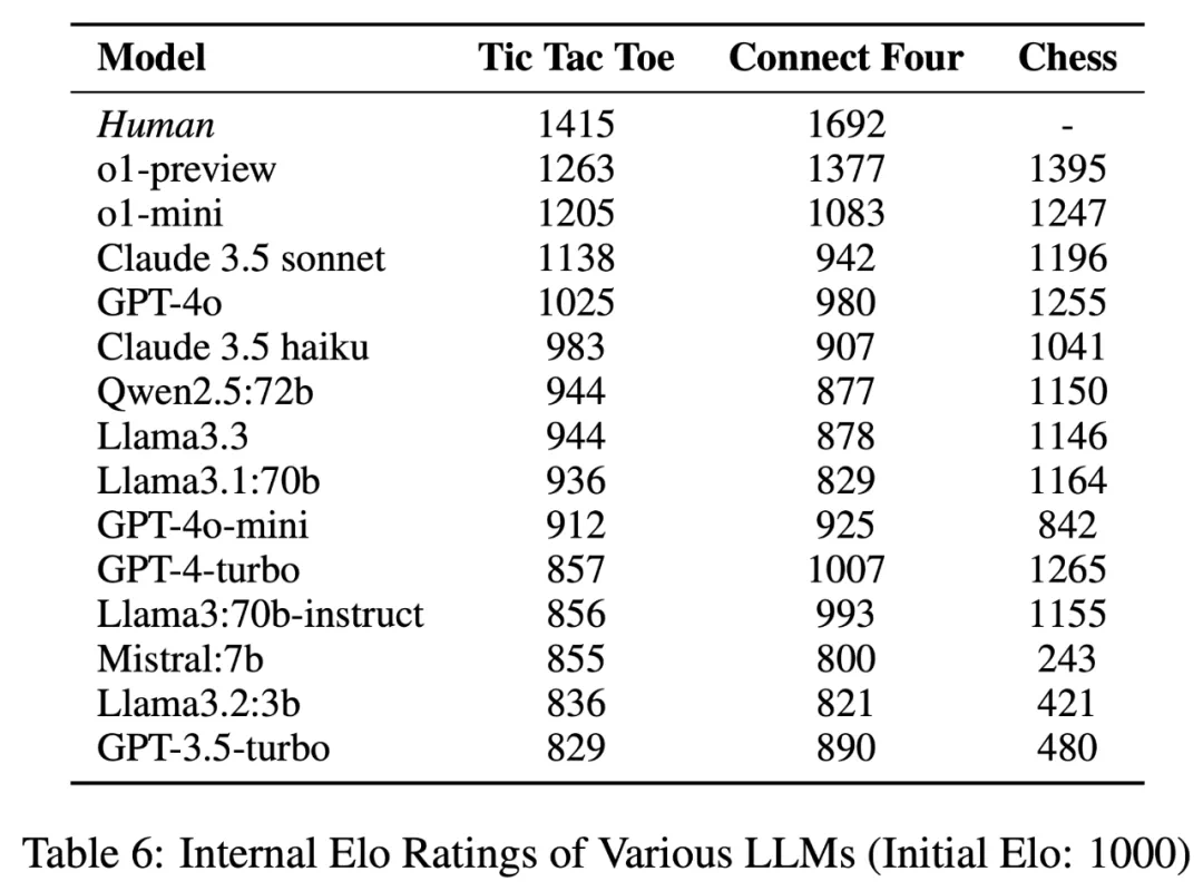 四子棋(Connect Four)与国际象棋(Chess):游戏 Solver(如 Stockfish 引擎)对所有测试的 LLMs 保持 100% 胜率。 -