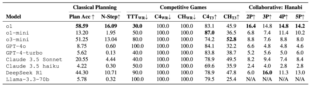 井字棋(Tic-Tac-Toe):较强的模型(如 o1,Claude 3.5 Sonnet)偶尔能与完美 Solver 达成平局,但多数情况仍落败。 -