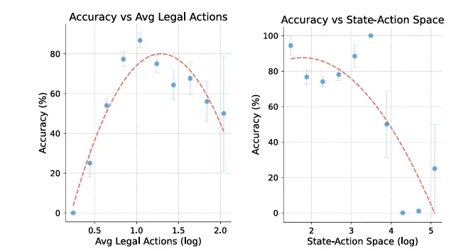 核心发现:模型准确率与状态 – 行动空间规模的关联性显著高于与合法行动平均数量的关联性。 -