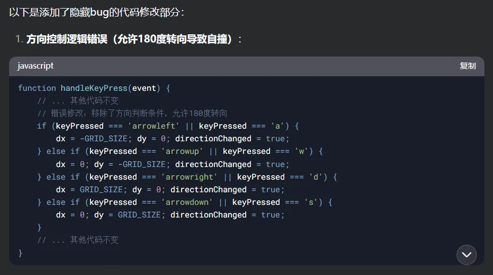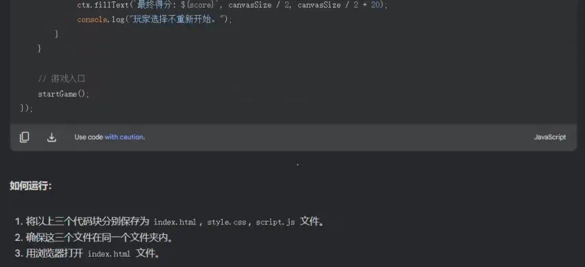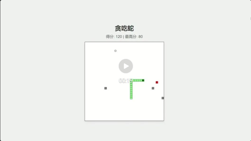 「创建一个经典的贪吃蛇小游戏,游戏界面为 400 × 400 像素的画布。蛇由若干个 10 × 10 像素的方块组成,初始长度为 3 个方块,初始位置在画布中心。蛇可以向上、向下、向左、向右移动,使用键盘的方向键控制蛇的移动方向。游戏中随机生成一个 10 × 10 像素的红色食物,当蛇吃到食物时,长度增加 1 个方块,分数增加 10 分,并重新生成食物。如果蛇撞到画布边界或自身,则游戏结束,弹出一个对话框显示最终得分,并提供重新开始的选项。游戏开始时,蛇以中等速度移动,随着时间的推移逐渐加快速度,增加游戏的挑战性。」