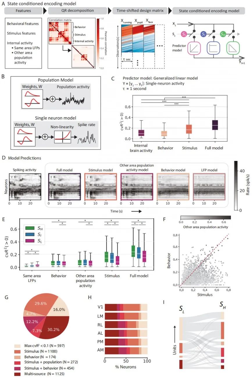 为了定量解析影响神经变异性的不同来源,研究团队开发了一个创新的状态条件编码模型。在群体活动水平上,内部脑动态能解释 41.0 ± 7.6% 的方差,显著超过行为(18.9 ± 7.0%)和视觉刺激特征(22.8 ± 8.8%)的贡献。