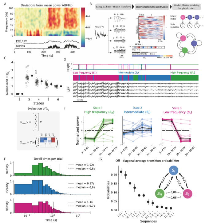 这些状态与动物的行为表现出显著关联:高频态伴随瞳孔扩张和运动增加,表征高度警醒状态;低频态对应静息状态;而中间态则作为状态转换的必经桥梁。