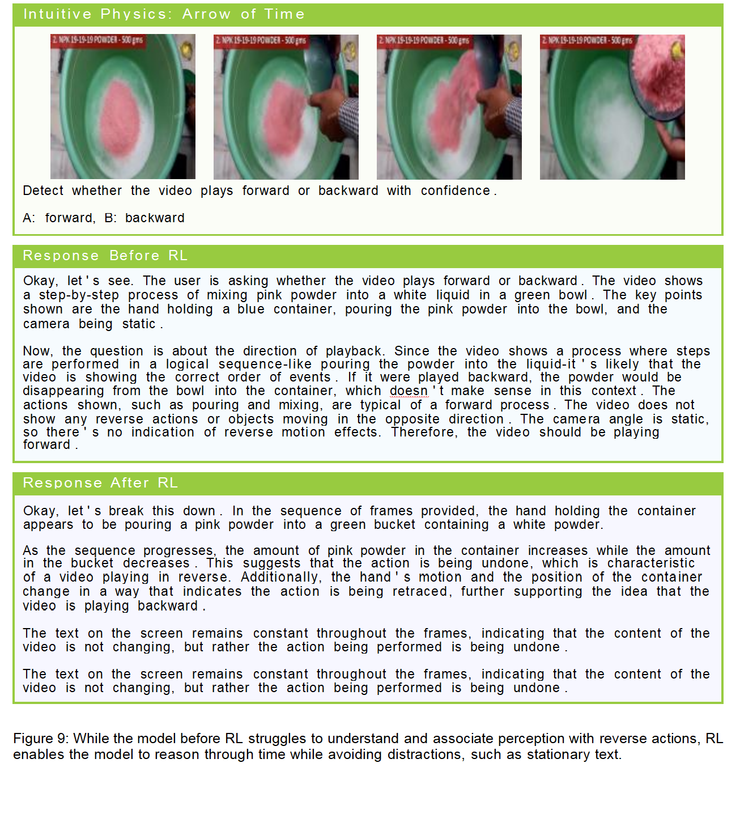 为了测试模型的直观推理能力,他们为三个任务(时间箭头、空间谜题与物体持久性)中的每一个任务都策划了 100 个视频,并生成 100 个问题。