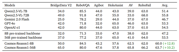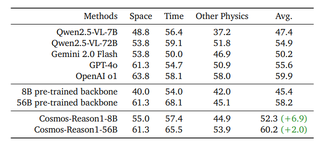 在物理常识的基准上,Cosmos-Reason1-8B 与 56B 的效果都显著提升,尤其是 56B 的效果全面超过 Qwen2.5-VL-7B 与 72B、Gemini 2.0 Flash 与 GPT-4o,只稍逊于 OpenAI 的 o1: